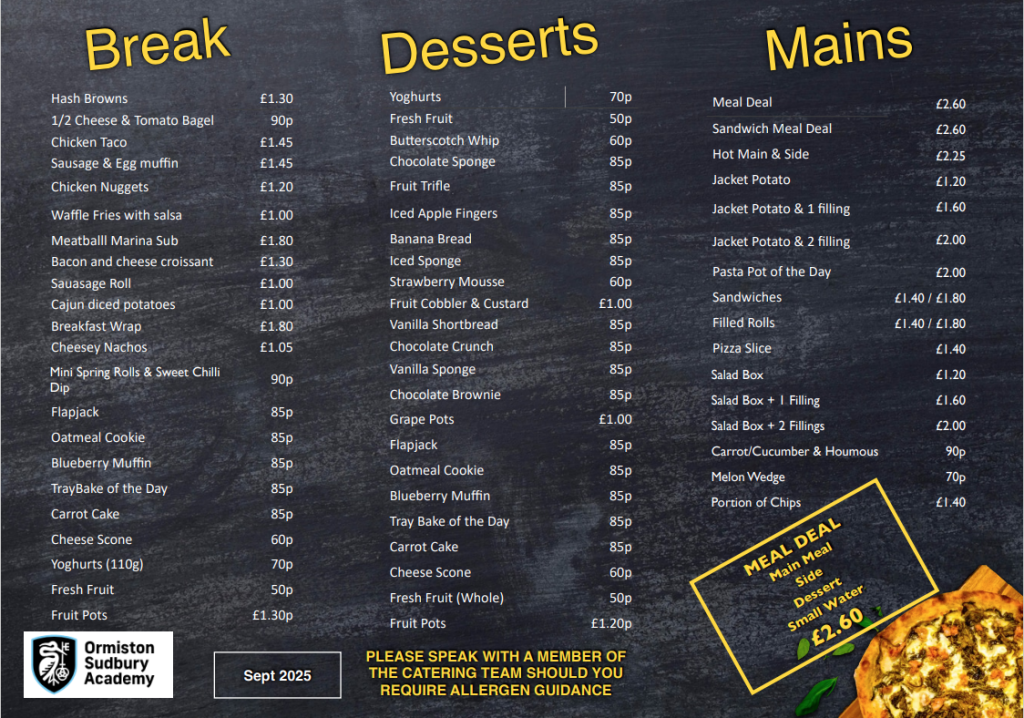 All students will be set up with a cashless account (for parents to access to pay/top up credit) and a PIN (to use at the canteen to pay for food/drink items purchased) when they start at the Academy.