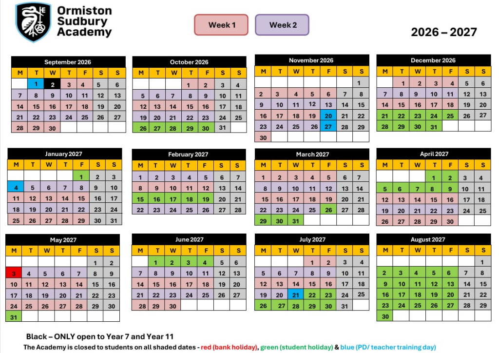 PD DAYS (*no OSA students in attendance): Tuesday 1st September, Friday 20th November (provisional), and Friday 27th November 2026 (provisional).